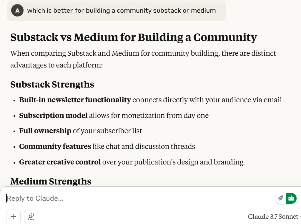 At the time of writing, the most intelligent model with Claude is the 3.7 Sonnet. I tested it after I got frustrated with Gemini. Nowadays, it should not be a barrier to trying a tool because testing it is so simple. So I signed in with Claude, checked that it was using the latest model, and entered my prompt. Claude started spitting out well-thought-out bullet points that were just on the right level. I felt that I had arrived home after a frustrating experience with Gemini, and after doing more work with Claude it became my go-to tool for market research.