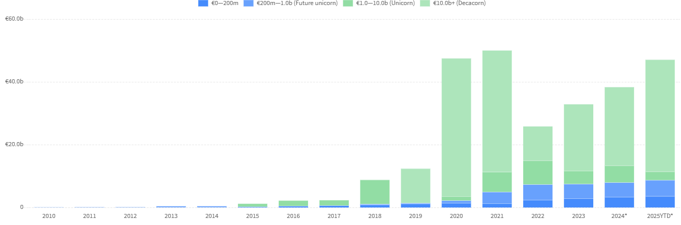 The size distribution is also impressive, with at least 10 SaaS unicorns so far, eight above $100m million valuation, and seven with a valuation between $50m and $100m to date. Notable successes and unicorns are Pipedrive (partly exited), Wise (a global money transfer, independent) and Veriff (an identity platform, independent). The total valuation of Estonian startups has reached an impressive €47 billion in 2025 to date, growing annually by 20%.