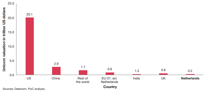 Even though European companies are competitive, particularly in the SMB market, US unicorns make up 75% of the global unicorn value, while European unicorns only make 1% (see the image below from PwC Research).