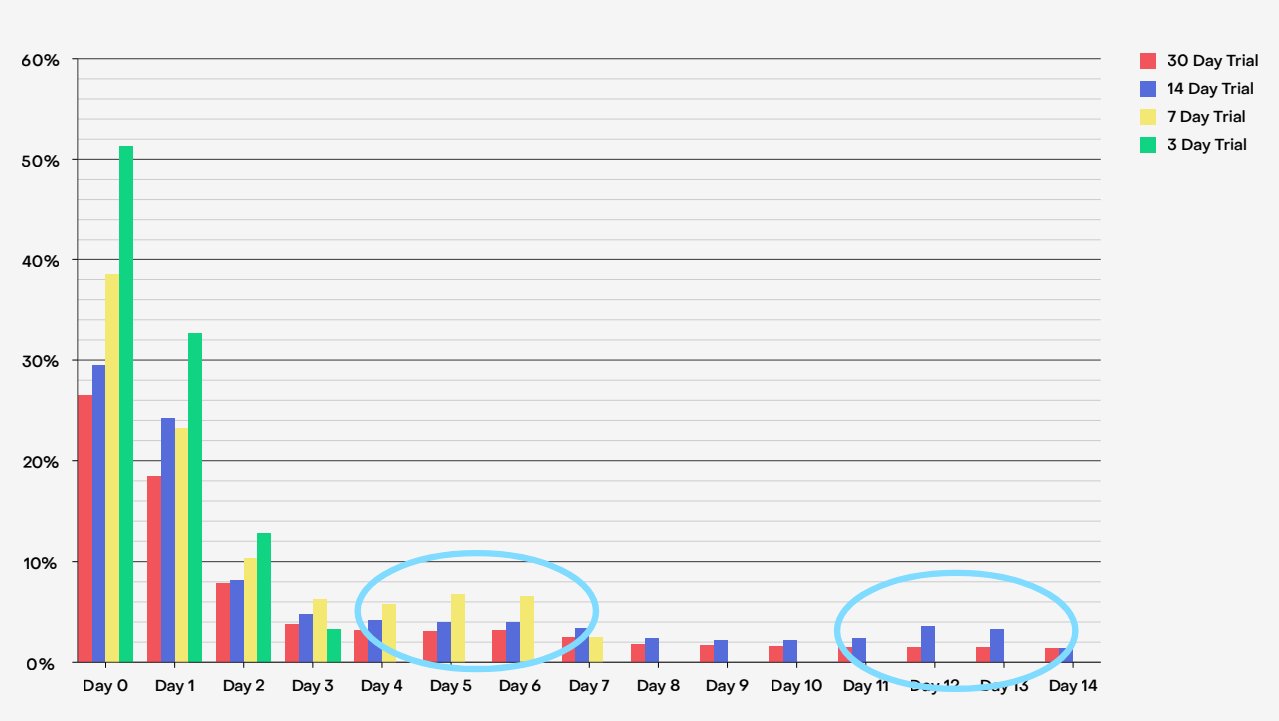 It is likely that we are all guilty of putting things off until the last minute. We now have evidence of that as well. The chart below draws the amount of trial cancellations received per day for different trial periods. Observe the distinct increase prior to the conclusion of the 14- and 30-day trials.